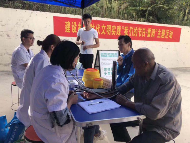 义诊的医生们在搭建的简易的棚子里认真的帮老人们量血压,老人们热心咨询关于健康方面的知识,医生们也都耐心解答。